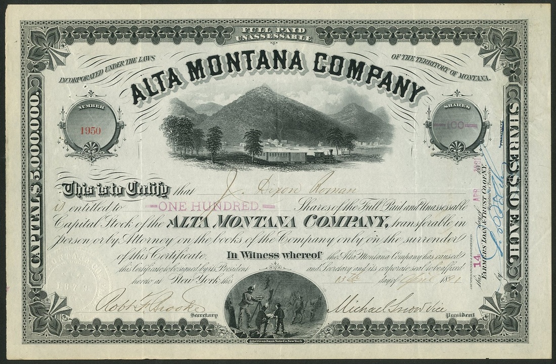 Alta Montana Company, Montana, $10 shares, New York 18[81], #1950, lovely vignette of railroad passing mining town, miners at bottom, black. GVF.