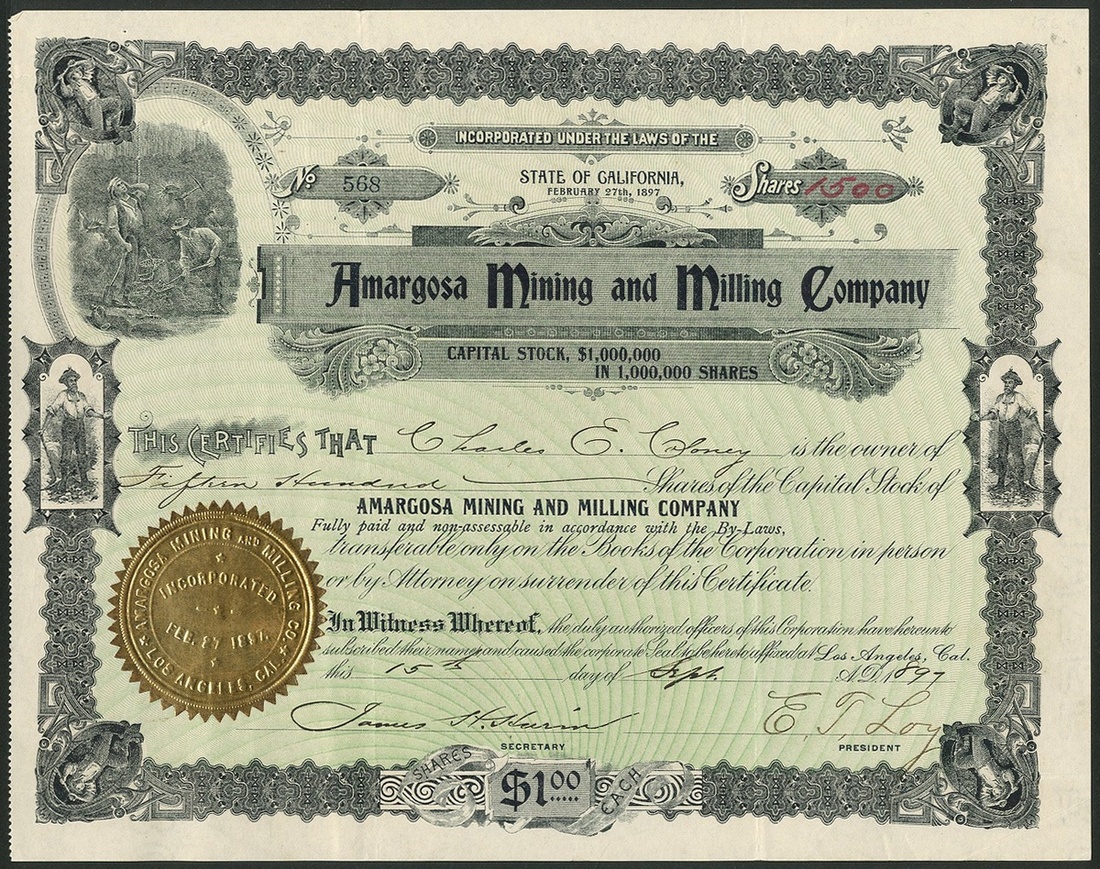 Amargosa Mining and Milling Company, California, $1 shares, 1[897], #568, miners at work, black, gold seal, green underprint. Mines at Bullfrog, Nye County, Nevada. GVF.