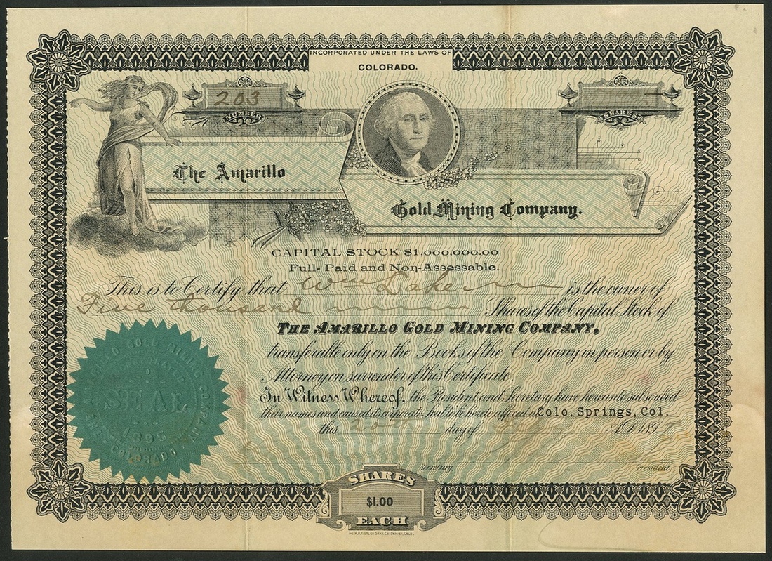 Amarillo Gold Mining Company, Colorado, $1 shares, Colorado Springs 189[7], #203, Washington in centre, black, green underprint. Incorporated 1895, owned 4 patented claims at Cripple Creek. Some light discolouration, VF and scarce.