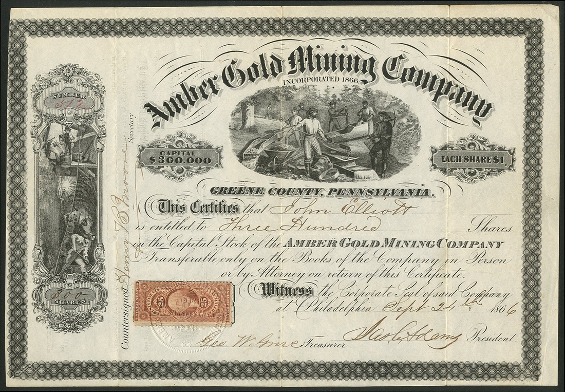 Amber Gold Mining Company, Pennsylvania, $1 shares, Philadelphia 186[6], #512, two attractive mining vignettes, black. A reconstruction of the Amber Oil Company which, whilst drilling for oil, struck a gold quartz vein at 600 feet. VF.