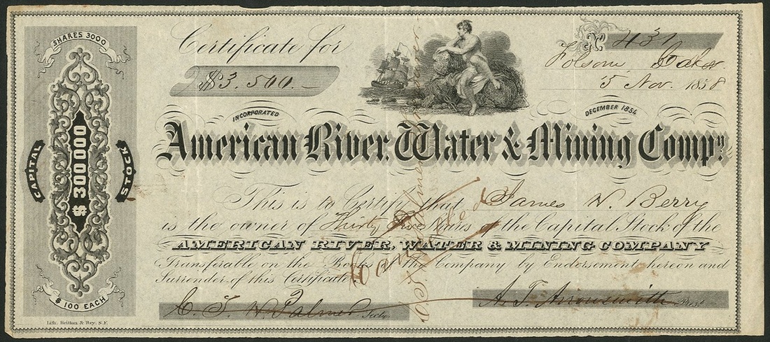 American River, Water & Mining Company, $[3,500] stock, Folsom 185[8], #431, allegorical figure at top, black. Formed in 1854 in conjunction with the Natoma Water & Mining Company to provide irrigation and water service to the area around Folsom, California. Responsible for the building of the first Folsom Dam and also a 2,000 acre vineyard outside Sacramento. VF.