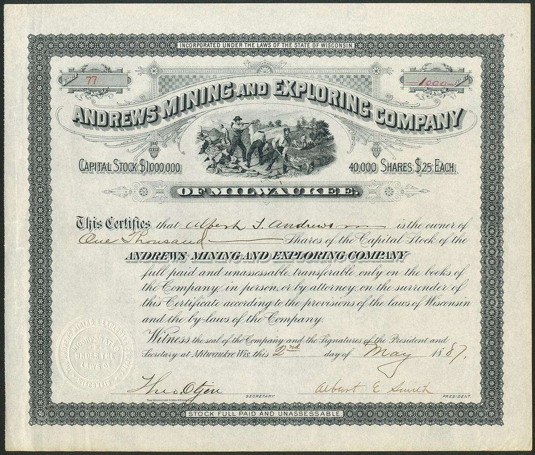 Andrews Mining and Exploring Company, Wisconsin, $25 shares, Milwaukee 18[87], #77, attractive vignette of miners at top, black. Formed to acquire claims west of Lake Gogebic, Michigan to mine copper. EF.