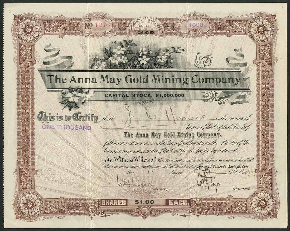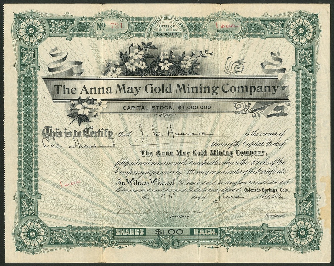 Anna May Gold Mining Company, Colorado, pair of certificates for $1 shares, the first 189[9], #721, green and 1[899], #1276, brown, both of same design with flowers at top. Mines in the Cripple Creek Mining District. F-VF (2).