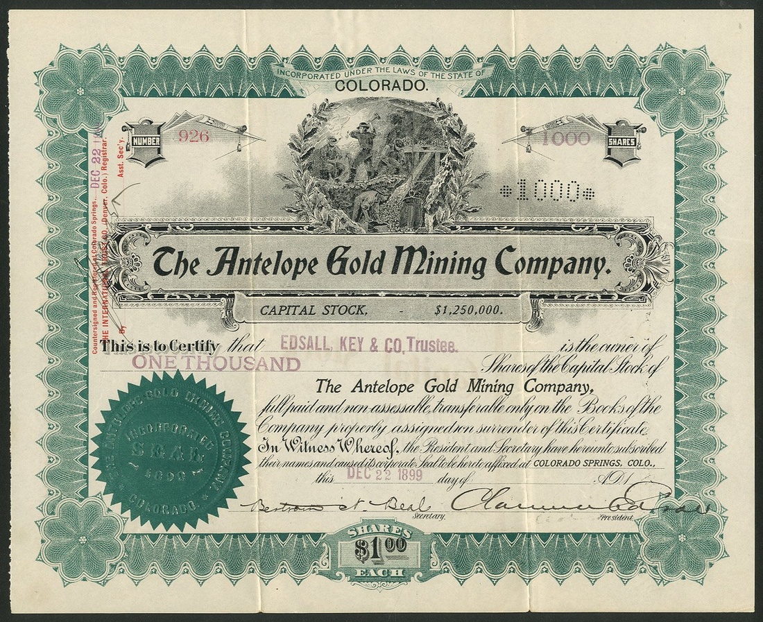 Antelope Gold Mining Company, Colorado, $1 shares, Colorado Springs 1[899], #926, miners at top, green and black. Mines in the Cripple Creek Mining District. VF.