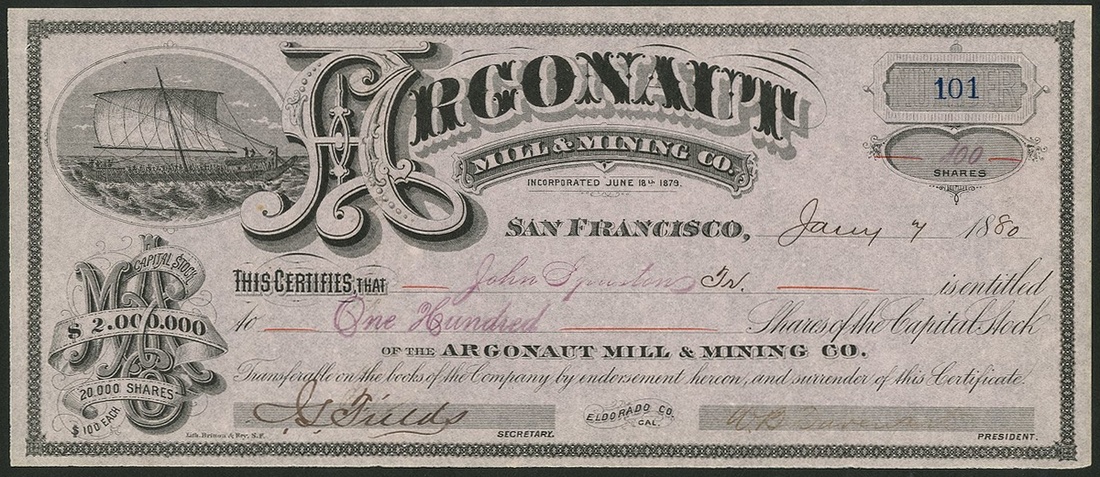 Argonaut Mill & Mining Company, California, $100 shares, San Fransisco 18[80], #101, lovely sailing vessel top left, black on pink paper. Mines in Eldorado County. EF.