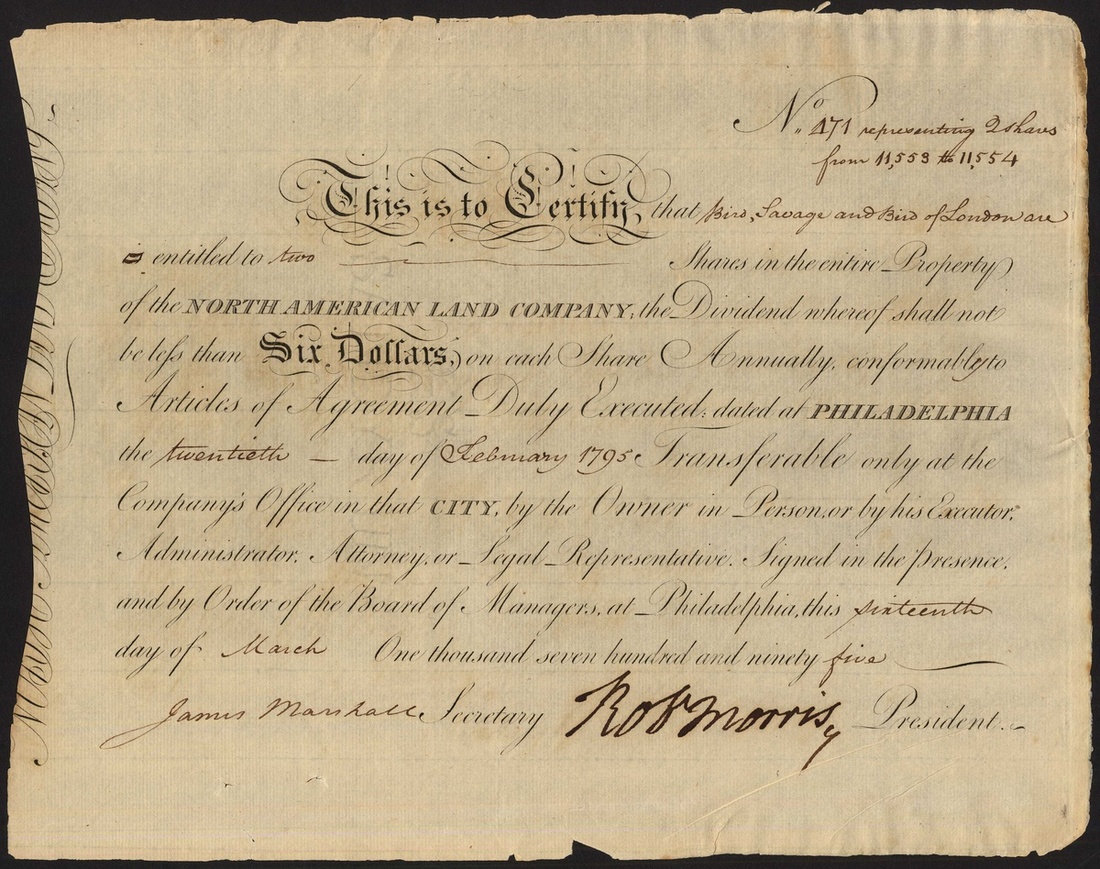 North American Land Company, certificate for [2] shares, 179[5], #471, signed by Robert Morris as President, scrollwork at left, black. Good signature with no ink burning, small tear and chip at bottom edge, brittle paper, GVF