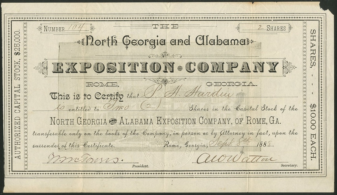 North Georgia and Alabama Exposition Company of Rome, $10 shares, Rome 188[8], #104, underprint of exposition buildings, black and grey. One of the biggest expositions in the south, held in Rome, followed soon after by another in Augusta. Tip of top right corner missing otherwise VF and scarce.