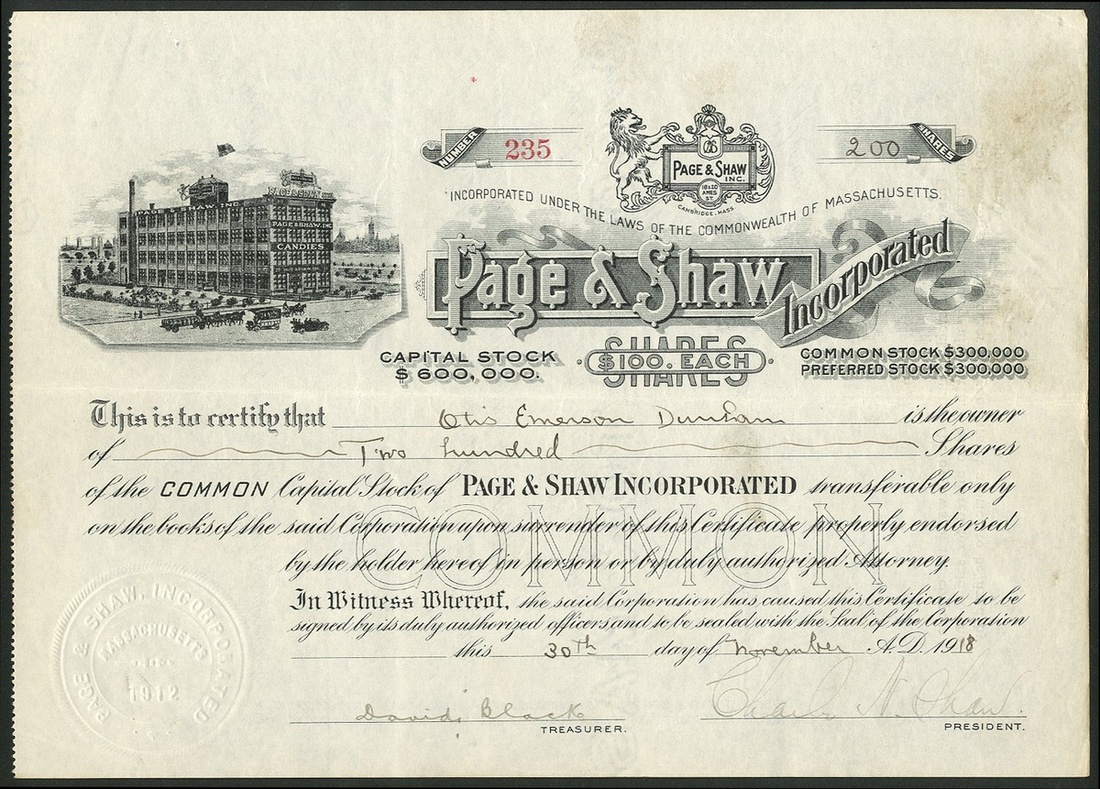 Page & Shaw Incorporated, Massachusetts, $100 shares, common stock, 19[18], #235, large candy factory top left, black. Established in 1888 but this company formed in 1912 to build the large factory in Cambridge. This certificate issued to and signed on the reverse by Otis Emerson Dunham. Dunham was a Boston lawyer who acquired control of the company by about 1920 and began a major expansion plan to make the company one of the largest candy manufacturers in the country. The 1929 crash hit the company badly and Dunham with others were found guilty of conspiracy in raising $2 million for stock and keeping half for themselves. The company was bankrupt soon after and was acquired by Daggett in 1931. VF and rare.
