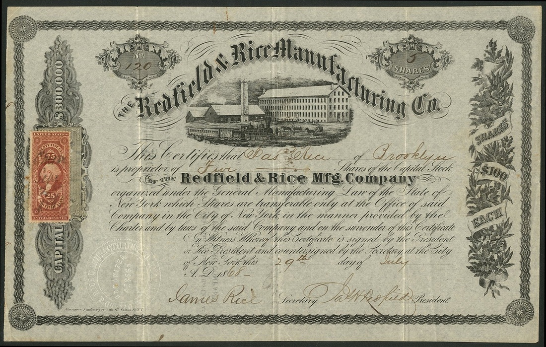 Redfield & Rice Manufacturing Co., $100 shares, New York 18[68], #120, signed by James Redfield as President and James Rice as Secretary, also issued to him and signed by him on the reverse, steam train in front of factory, black, adhesive revenue stamp. Both partners had been in the silver and electroplating business since the 1850's. Formed this company in 1866 but it was bankrupt by 1872. VF.