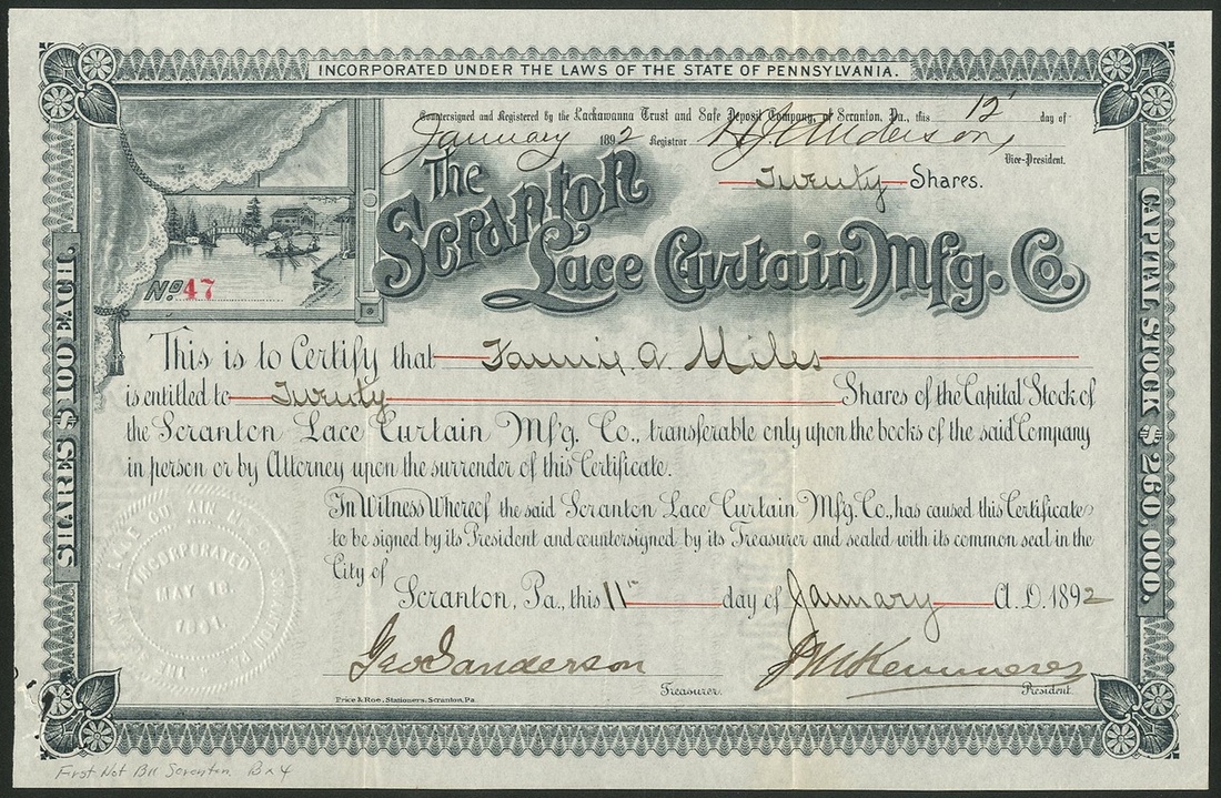 Scranton Lace Curtain Mfg. Co., Pennsylvania, $100 shares, 189[2], #47, interesting vignette of window with lace curtains top left, black. The company's stock was being offered in a large liquidation sale in 1897. Staple holes bottom left, GVF.