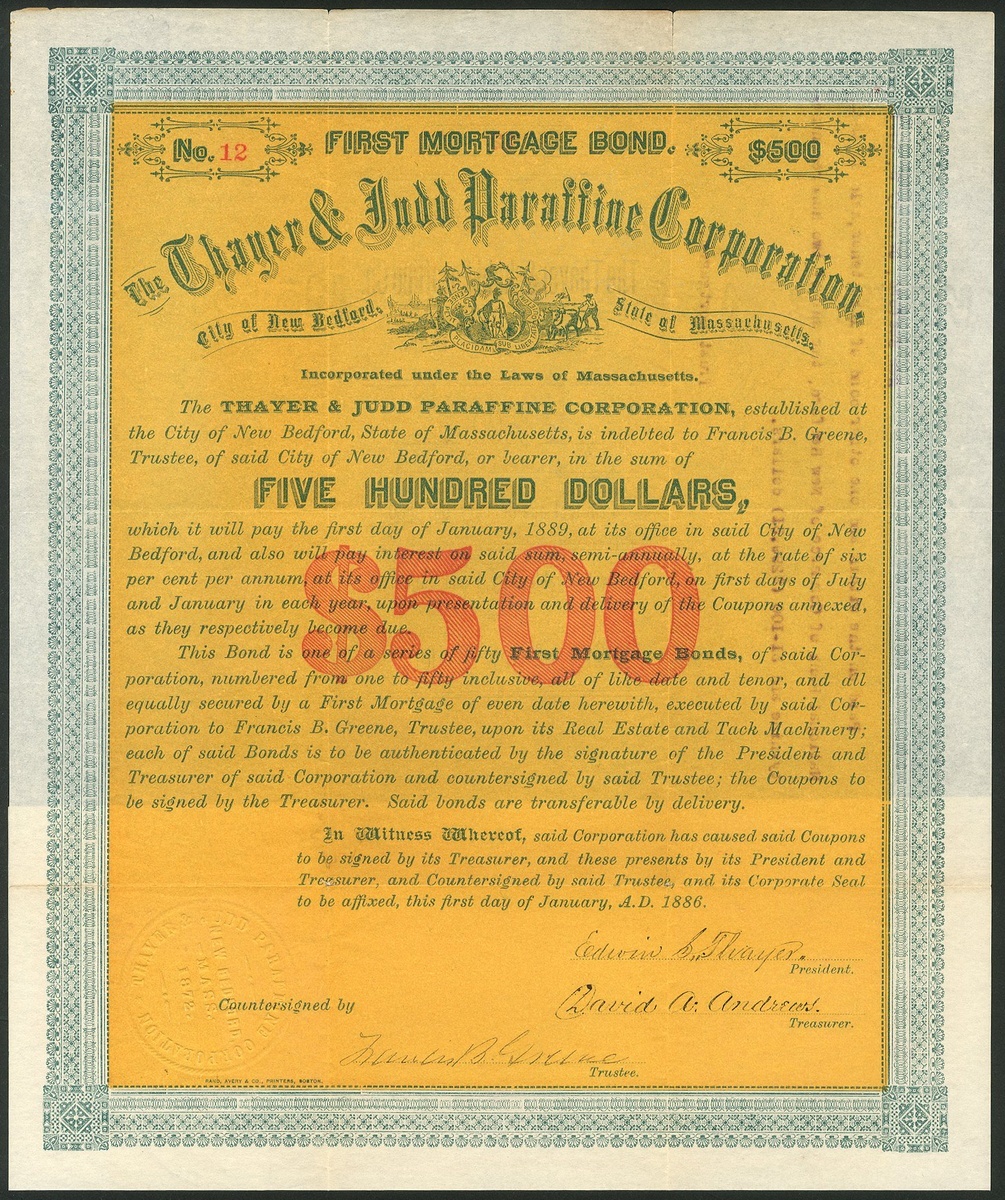 Thayer & Judd Paraffine Corporation, New Bedford, Massachusetts, First Mortgage bond, $500, 1886, #12, of only 50 issued, arms in centre, blue with heavy yellow underprint. Incorporated in 1872 but insolvent by 1887 with debts of $40,000. VF and scarce.