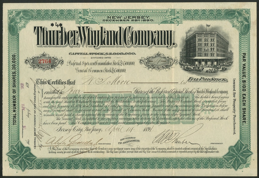Thurber, Whyland Company, New Jersey, $100 preferred stock, Jersey City, 189[1], #2764, signed by Horace K. Thurber as President, large retail building top right, green and black. VF.