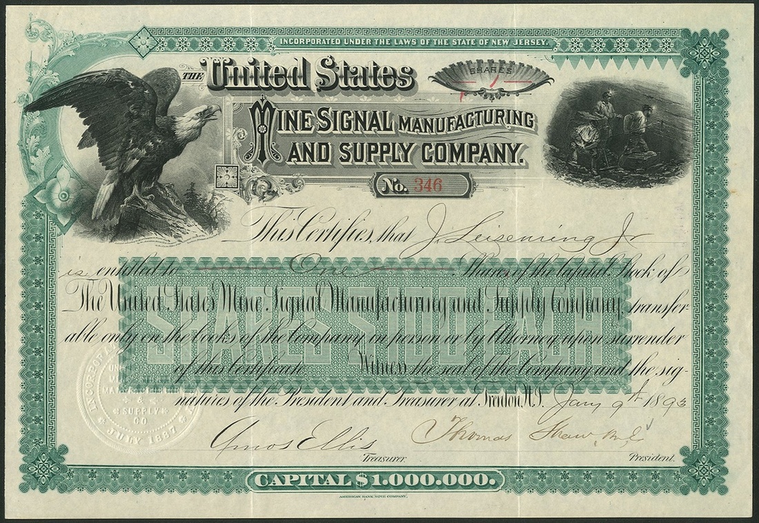 United States Mine Signal Manufacturing and Supply Company, New Jersey, shares, Trenton 18[93], #346. miners at work underground at right, eagle at left, green and black, ABNCo. printing. An apparatus for testing for explosive gases in underground mines invented by Thomas Shaw, who signs as president. EF.