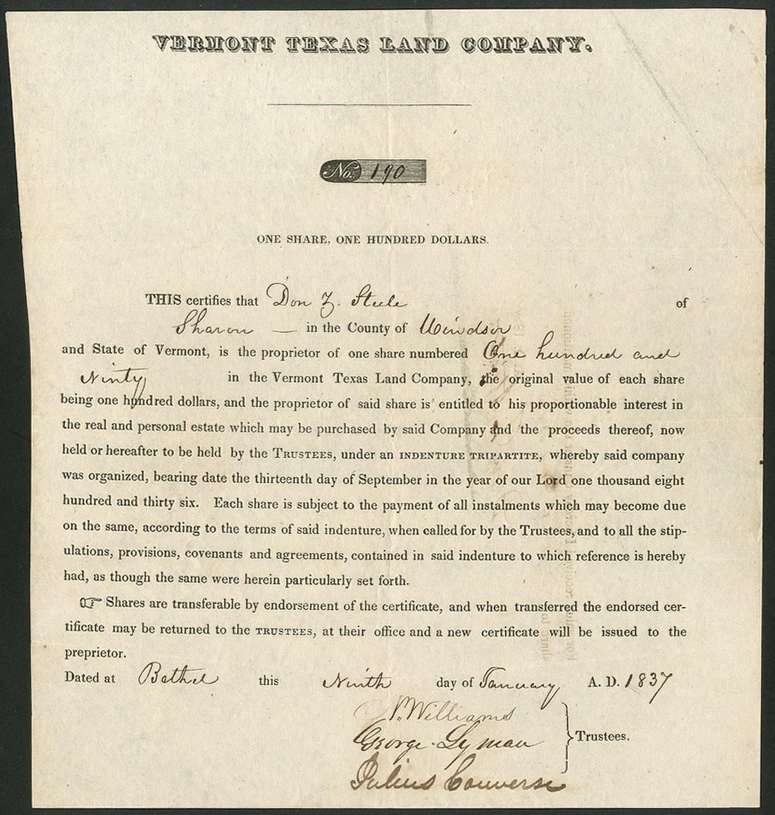 Vermont Texas Land Company, one share of $100, [1837], #190, plain black printing but scarce early piece. Signed by Julius Converse as one of the trustees. Julius Converse, 1798-1885, 34th Governor of Vermont, 1872-1874. The company was formed on 13th September 1836 to purchase real estate in Texas. There is no evidence that any land was acquired but the shares certainly circulated in Vermont until the mid 1840's. VF.