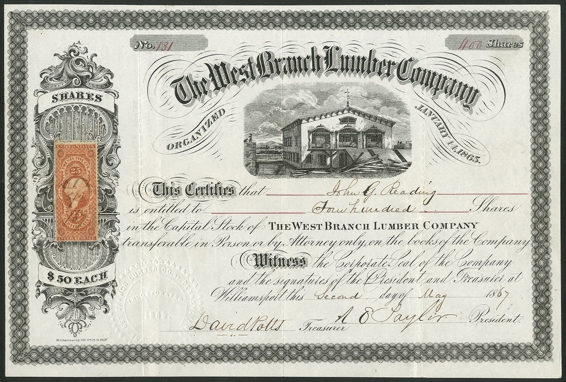 West Branch Lumber Company, Pennsylvania, $50 shares, Williamsport 18[67], #131, factory in centre, black. VF and scarce.