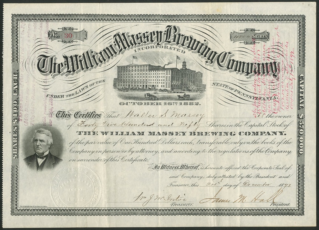 William Massey Brewing Company, Pennsylvania, $100 shares, 18[91], #30, large brewery at top, portrait of William Massey at left, black. The company was America's 11th largest brewery which closed in 1894, 3 years after Massey's death. AEF and rare.