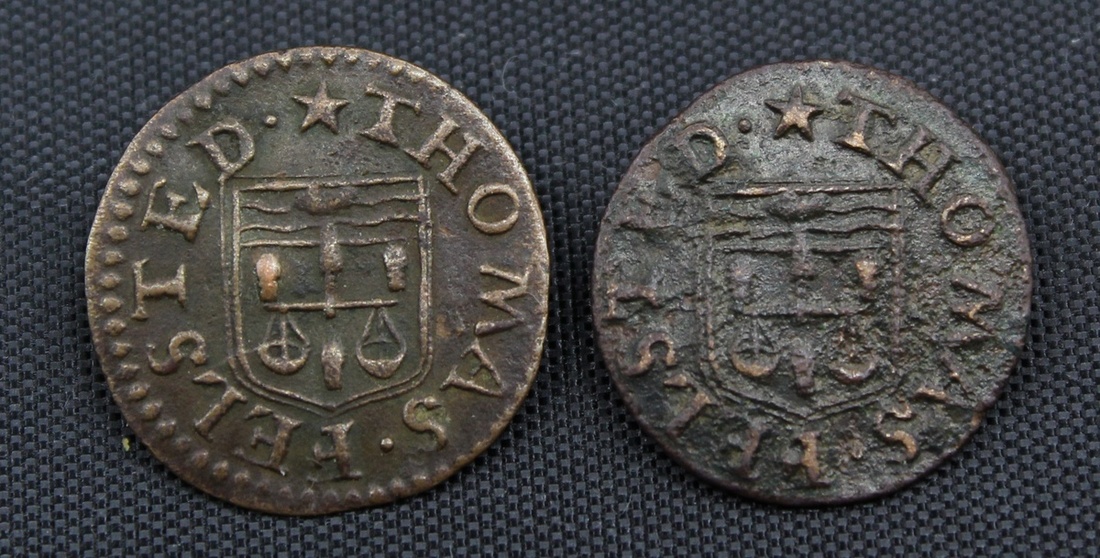 Cambridge, Thomas Felsted (Baker), Farthings, 1664, in copper alloy, 3h, m.m. star (2), (m.m.) THOMAS • FELSTED •, Baker's Arms, rev. (m.m.) IN • CAMBRIDG • 1664, T *F* D in centre (Cooper [1845] pp. 541; Babington 26; Searle 24; Boyne & Williamson 42; SCBI Norweb I, 385; Dickinson, Cambs 42), the first evenly struck, good very fine, the second with some verdigris otherwise a bold very fine (2)