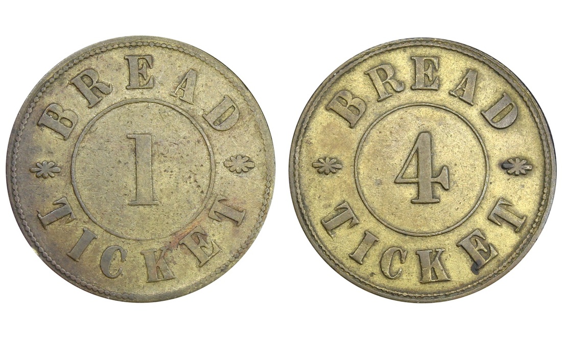 Bedfordshire, Biggleswade, Union, Brass Bread Tickets, (pre-1863), 28mm. (2), BIGGLESWADE UNION | 1, rev. BREAD TICKET | 1, edge milled, 12h (Neumann [1863], pp. 301, 26226-27); another, similar, but no. 4, edge milled, 12h, the first very fine, the second good very fine (2)