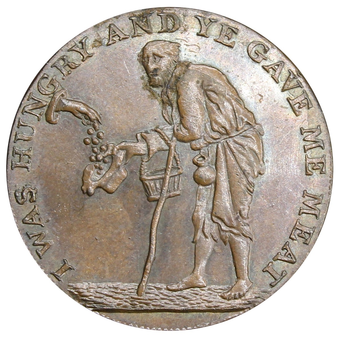Gloucestershire, Badminton (Duke of Beaufort Estate), Mule Halfpenny, 1796, obv. of Jelly & Arnott's Halfpenny, THE SALE OF CORN BY WEIGHT PROPOSED 1796, scale balance, rev. I WAS HUNGRY AND YE GAVE ME MEAT, beggar receiving alms from disembodied hand to left, edge plain, 6h, 10.31g (Conder 294/306; Atkins 32/27; D&H 49), light chocolate patina overlying attractively lustrous surfaces, about extremely fine, scarce