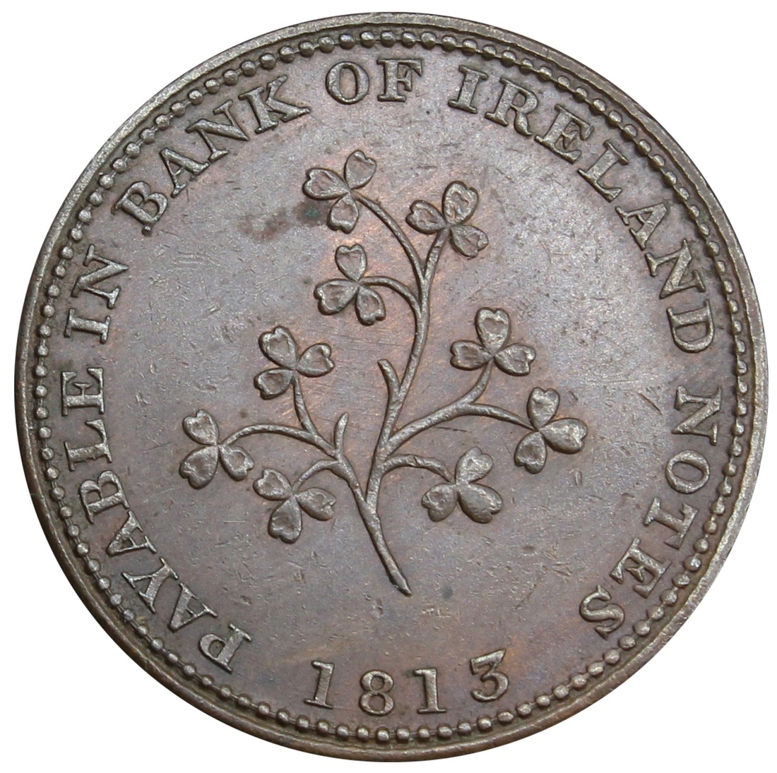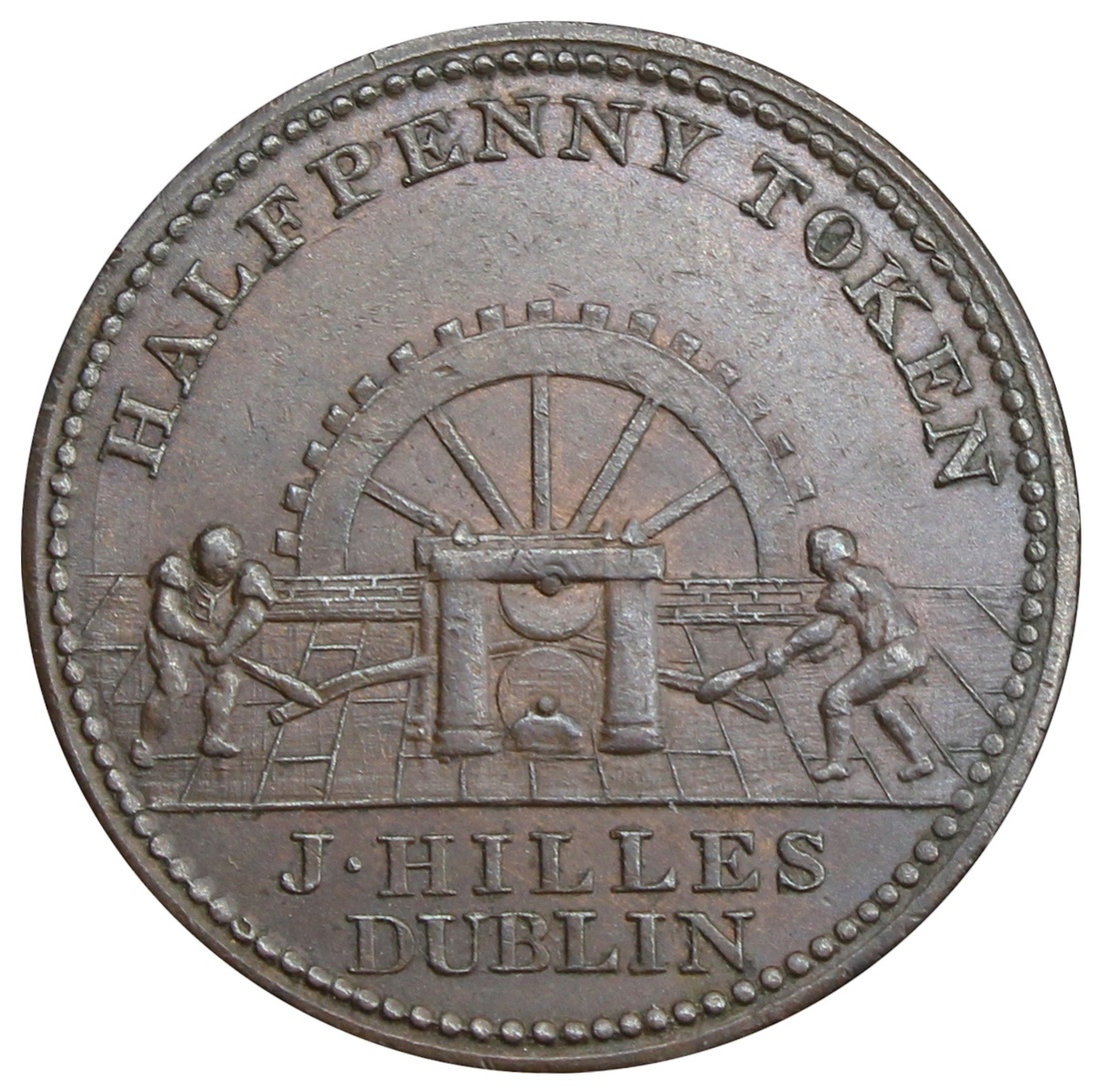 Ireland, Dublin (J. Hilles), Halfpenny, 1813, HALFPENNY TOKEN, two men attending to a rolling reduction machine, J HILLES | DUBLIN, rev. PAYABLE IN BANK OF IRELAND NOTES | 1813, sprig of shamrock, 12h, 9.22g (Withers 1820; Davis 58), chocolatey patina overlying lustrous surfaces, trace mint colour in recesses, extremely fine, scarce thus