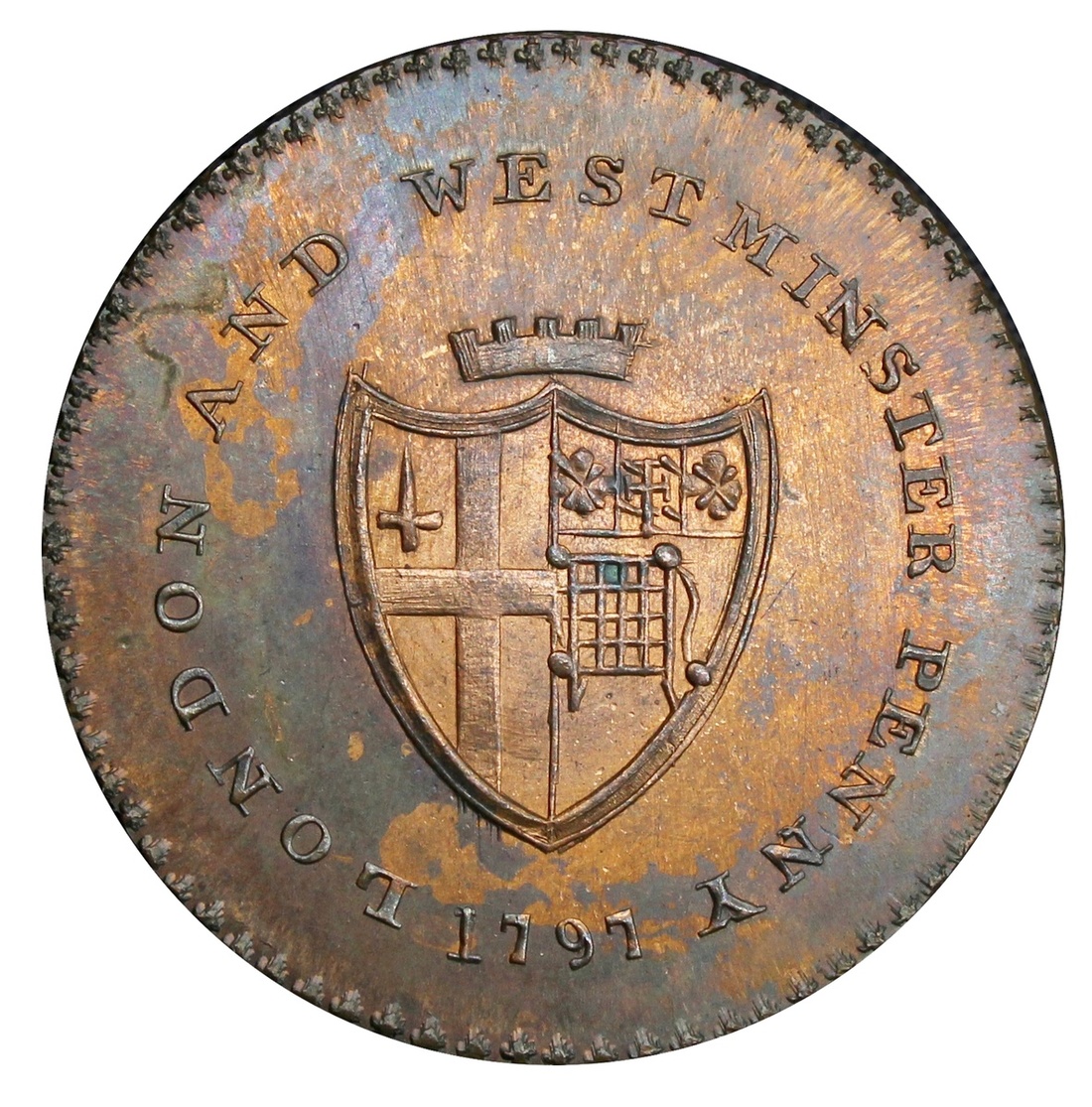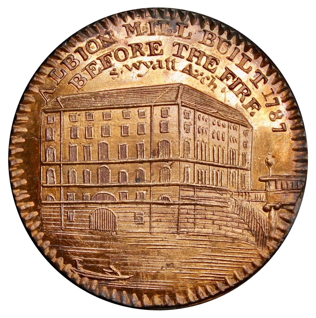 Middlesex, Southwark, Albion Mill (Skidmore's), Penny, 1797, LONDON AND WESTMINSTER PENNY - 1791 -, crowned shield, rev. ALBION MILL BUILT 1787, BEFORE THE FIRE, S. Wyatt Arch.t, view of Mill from Northern bank of the Thames by Blackfriar's bridge, I PROMISE TO PAY ON DEMAND THE BEARER ONE PENNY on edge, 24.09g, 12h (Conder 79/95; D&H 92), some uneven partial toning on obverse, otherwise a superb example, with full mint red bloom on reverse, choice, practically as struck, rare thus