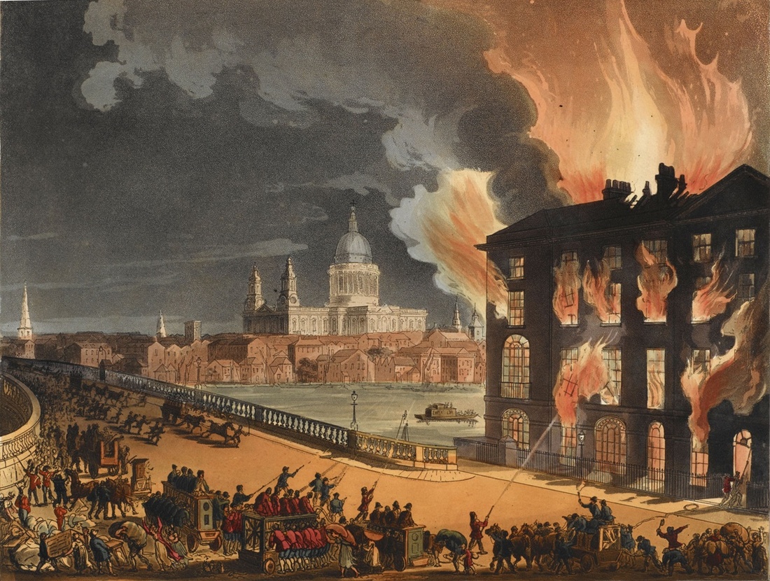 However, at 6:30, on the morning of March 2, 1791, a large fire broke out in a room on the second-but top floor of the building, possibly in a corn machine or in a pile of previously damp flour. Contemporary accounts record the blaze immediately took hold, and 'raged with such unabating fury, that in about half an hour the whole of that extensive edifice, together with an immense quantity of flour and grain was reduced to ashes' (Hampshire Chronicle, 7 March 1791). Arson was initially considered as the timing of the fire suspiciously occurred at ebb tide on the Thames, making it more difficult for the fire brigade to access water for their hoses. As the account continued: 'their assistance was ineffectual, for the flames burst out in so many different directions, and with such incredible fury and intolerable heat, that it was impossible to approach on any side till the roof and interior part of the building tumbling in completed the general conflagration in a column of fire, so awfully grand as to illuminate for a while the whole horizon.' It was noted as the fire raged, the platform of cannon normally used to signal to workers 'cooked off' successively until all were regularly discharged to the wonder of the gathering crowds in the street below. Once the fire reached the main barrel of gunpowder stored in the basement, a tremendous explosion was heard, sending flames 'ascending in spiral stream of liquid fire to an amazing altitude' which caused 'all the panes of glass in the opposite houses of Albion Place to crack incessantly and at so great a distance', as well as prompting all the pitch to melt on all the barges 'moored within 80 yards of the mill'.