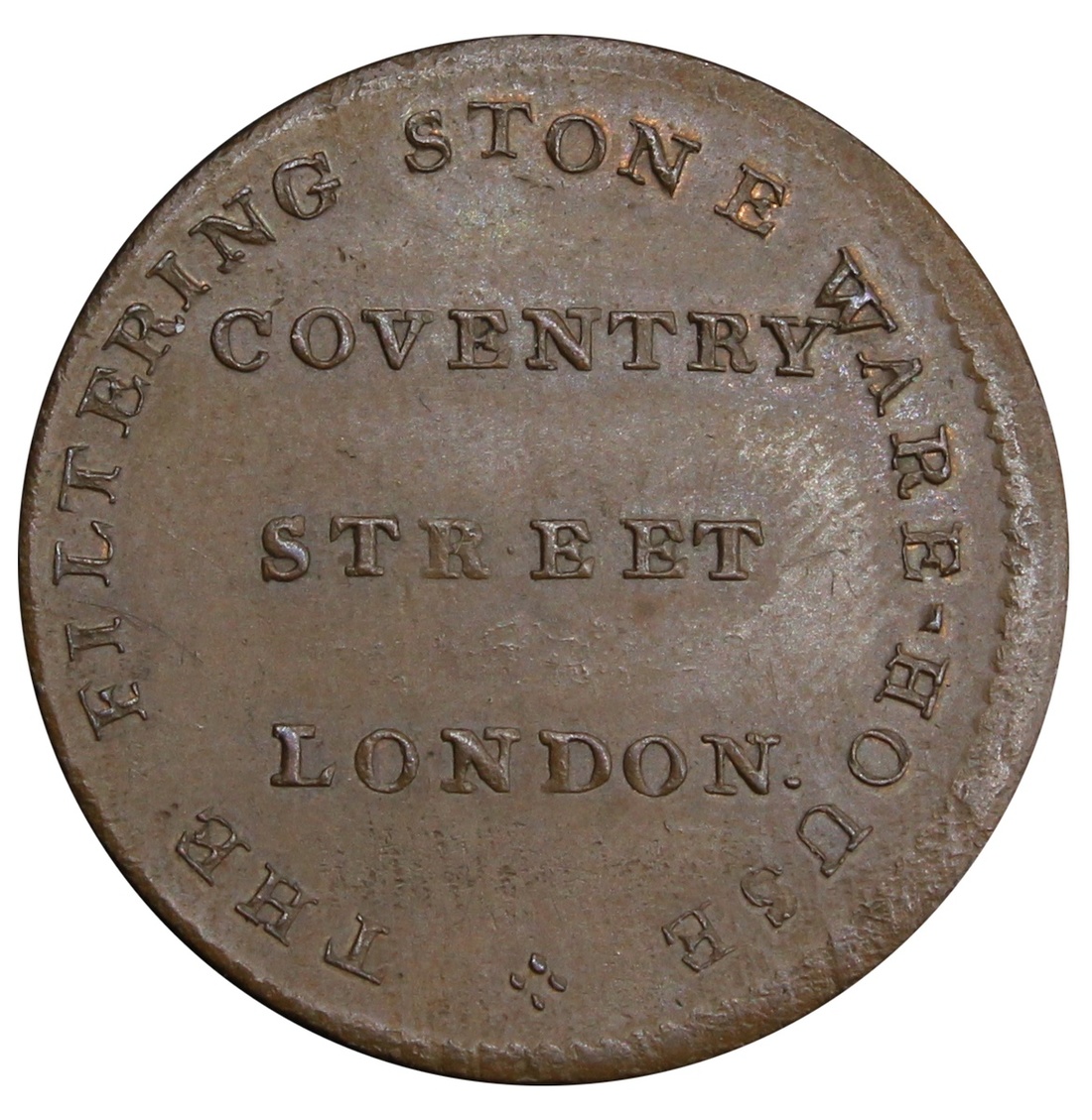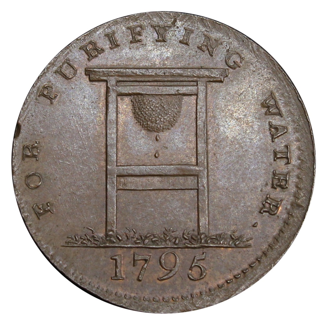 Middlesex, London, Coventry Street (Joshua Henderson), Halfpenny, 1795, THE FILTERING STONE WARE • HOUSE, COVENTRY STREET LONDON, rev. FOR PURIFYING WATER, sandstone percolation device, 1795 in exergue, edge plain, 6h, 8.87g (Conder 86/141; Atkins 92/210; D&H 292), chocolate patina with residual lustre in recesses, good extremely fine