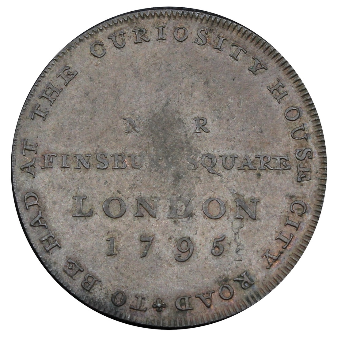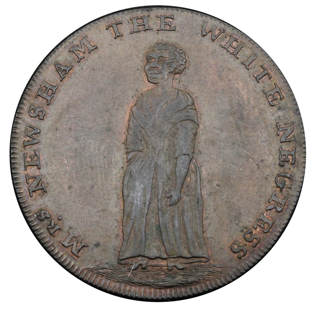 Middlesex, Finsbury Square (Hall's), Halfpenny, 1795, MRS. NEWSHAM THE WHITE NEGRESS, a woman standing slightly left, rev. TO BE HAD AT THE CURIOSITY HOUSE CITY ROA, NEAR | FINSBURY SQUARE | LONDON | 1795 in four lines across field, edge plain (D&H 317), softly struck in centre of reverse as typical, otherwise good very fine, with residual mint lustre in recesses, scarce