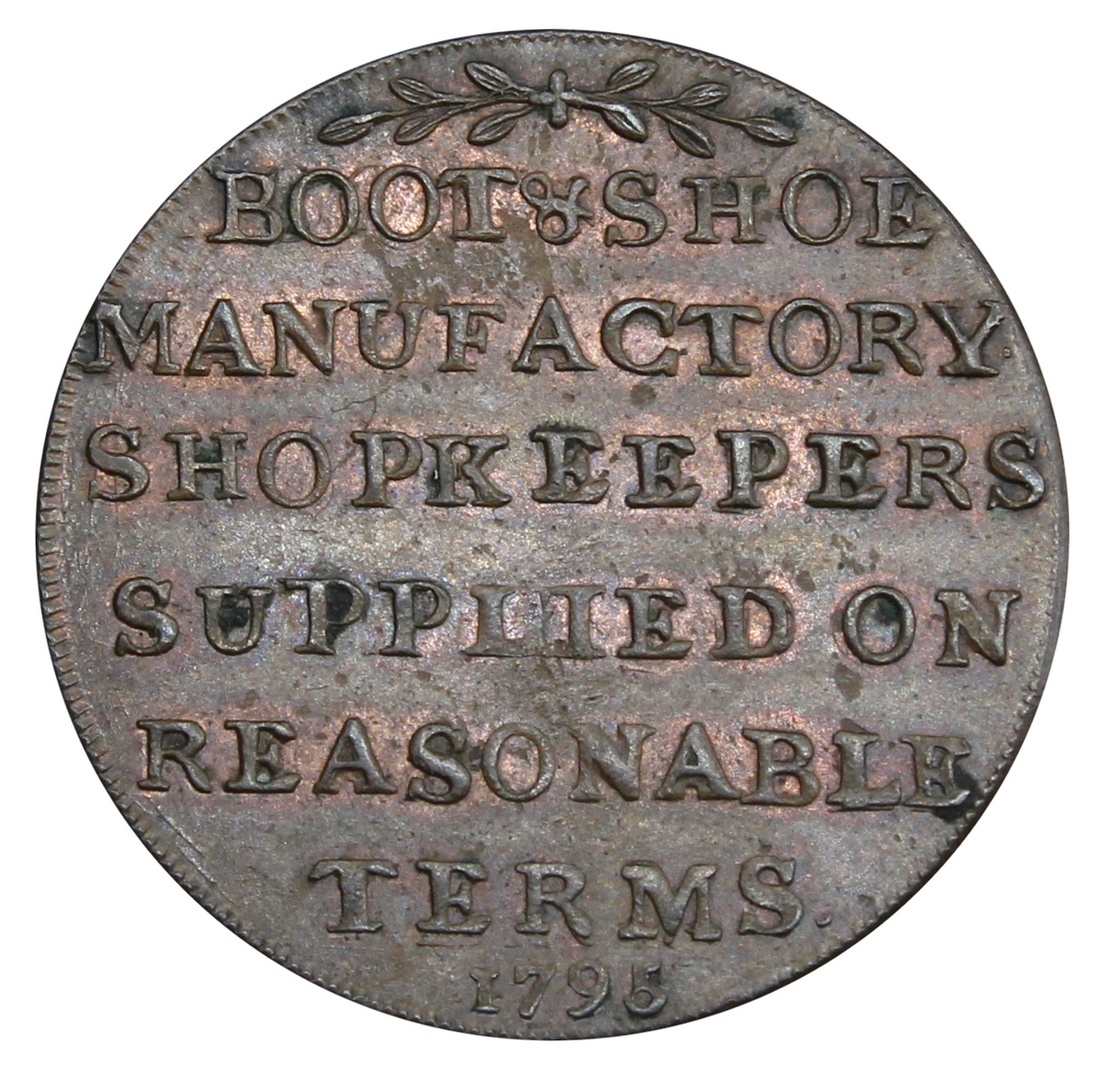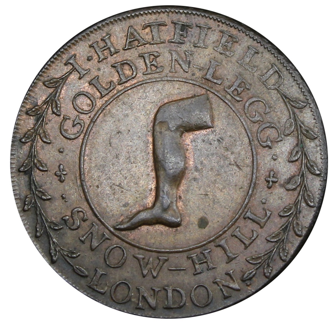 Middlesex, London, Snow Hill, Golden Legg (J. Hatfield), Halfpenny, 1795, I • HATFIELD | GOLDEN • LEGG | leg in centre | SNOW - HILL | LONDON around framed by wreaths, rev. BOOT & SHOE | MANUFACTORY | SHOPKEEPERS | SUPPLIED ON | REASONABLE | TERMS| 1795, edge plain, 6h, 9.23g (Conder 89/160; Atkins 96/234; D&H 323), the odd spot of carbon, otherwise light patina with good residual lustre in recesses, extremely fine or better