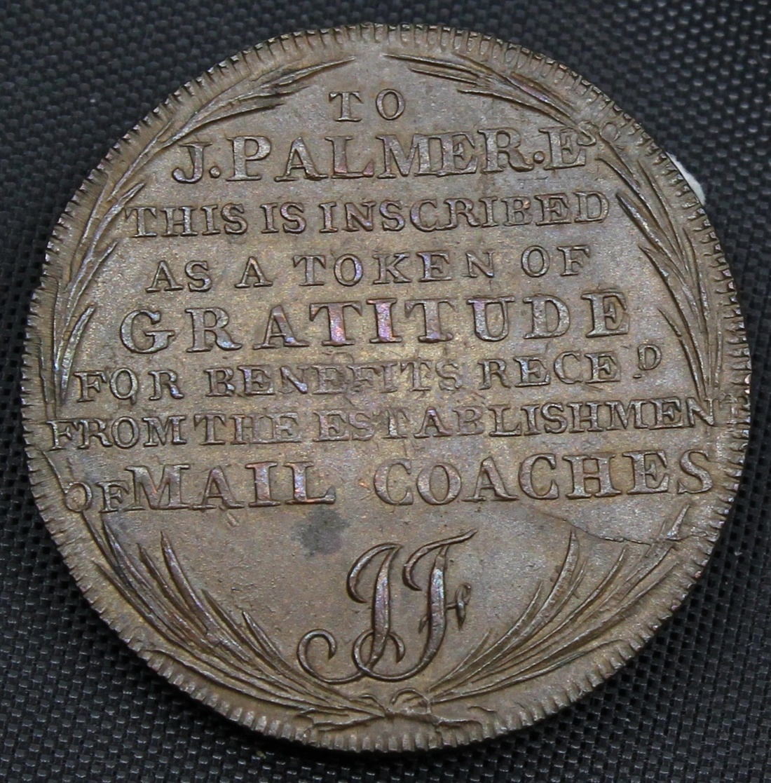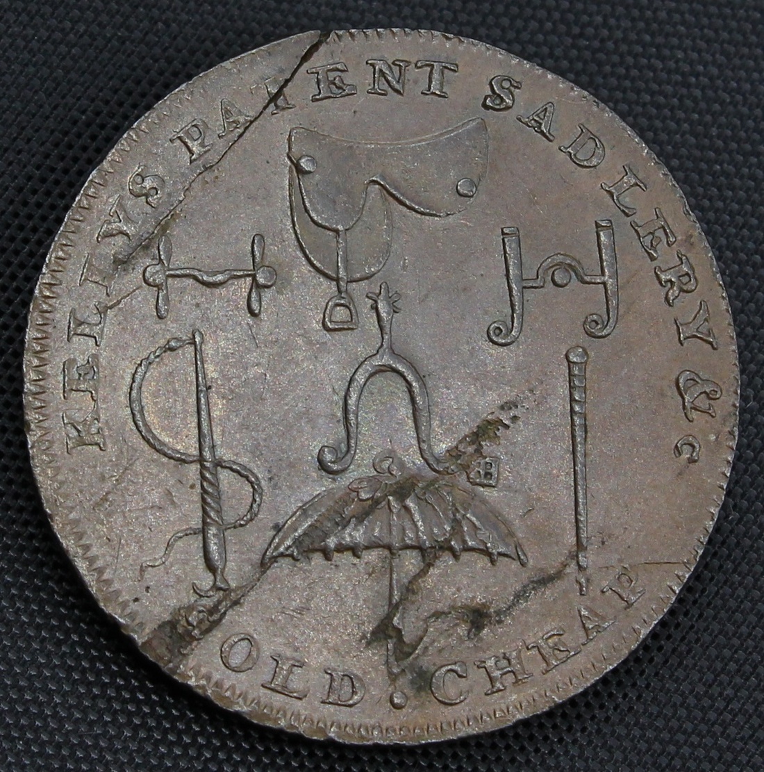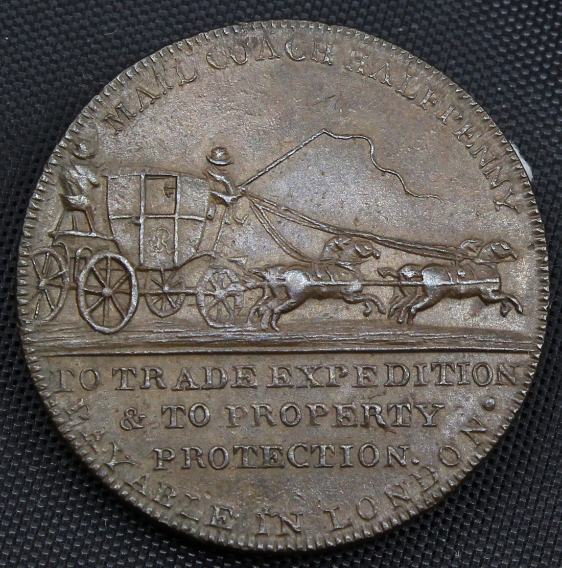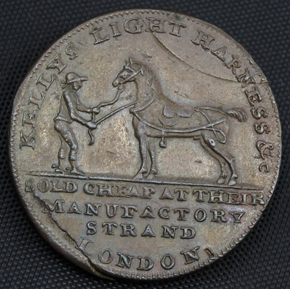 Middlesex, London, Halfpenny Tokens (2), (Strand, Jasper and Simon Kelly), undated, KELLYS LIGHT HARNESS & CO. postilion holding horse, SOLD CHEAP AT THEIR | MANUFACTORY | STRAND | LONDON. in exergue, rev. KELLYS PATENT SADLERY &c | SOLD CHEAP., accoutrements, PAYABLE AT LONDON on edge, 6h, 8.48g (Atkins 97/240; D&H 345), faulty flan with flecking and splits, otherwise struck extremely fine; also, (Lackington's Mail Coach), undated (c. 1797), MAIL COACH HALFPENNY PAYABLE IN LONDON around, mail coach pulled by four galloping horses; TO TRADE EXPEDITION & TO PROPERTY PROTECTION in exergue, rev. TO | J. PALMER . ESQ | THIS IS INSCRIBED | AS A TOKEN OF | GRATITUDE FOR BENEFITS RECED | FROM THE ESTABLISHMENT | OF MAIL COACHES, JF cypher below, edge plain, 12h, 8.70g (D&H 363), extremely fine (2)
