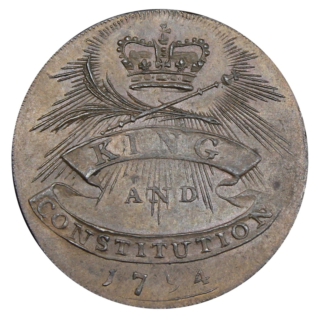 Middlesex, London, Newgate Prison, Halfpenny, 1794, NEWGATE | MDCCXCIV, front of prison, rev. KING AND CONSTITUTION 1794, crown and sceptre in wreath above, CURRENT EVERYWHERE on edge, 12h, 8.16g (Atkins 280; D&H 394), a hint of central striking softness, otherwise a light even brown patina ovelying lustrous surfaces, a pleasing extremely fine