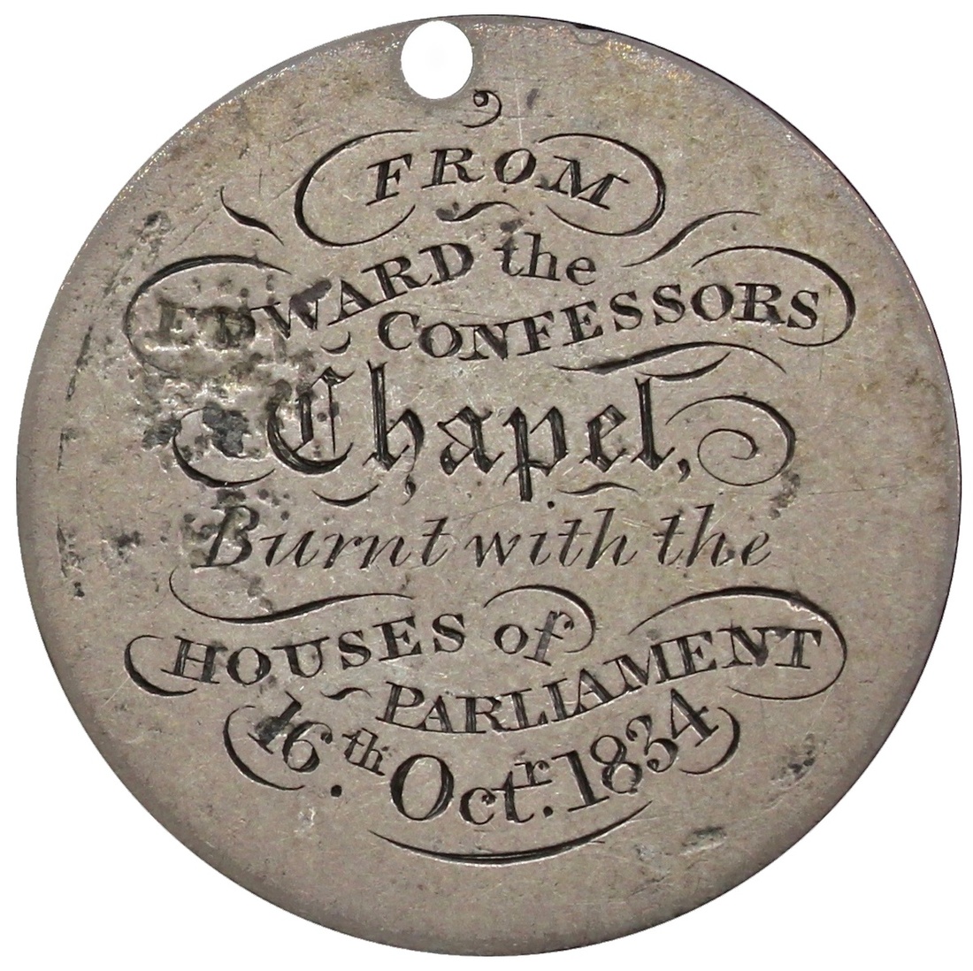 London, Edward the Confessor's Chapel, silver Ticket, 1834, Commemorating the destruction of the Chapel during the Houses of Parliament Fire of 16 October 1834, 25.5mm. x 0.6mm., 3.63g, pierced for suspension, uniface, otherwise very fine, an intriguing novelty, rare