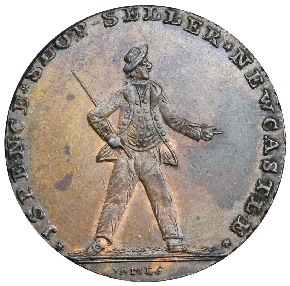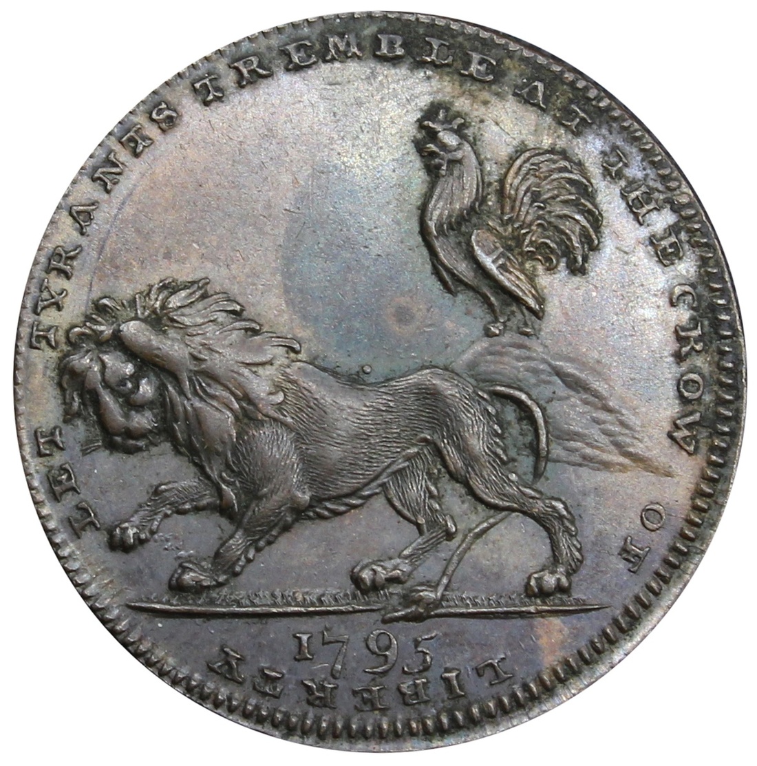 Northumberland, Newcastle-upon-Tyne (Spence's), Halfpenny Token, 1795, I SPENCE * SLOP SELLER * NEWCASTLE, sailor standing right, rev. LET TYRANIS TREMBLE AT THE CROW OF - LIBERTY, a lion dismayed, cockerel on rock behind, SPENCE x DEALER x IN x COINS x LONDON, 4h, 10.28g (Atkins 11; D&H 11), partial staining overlying residual, extremely fine