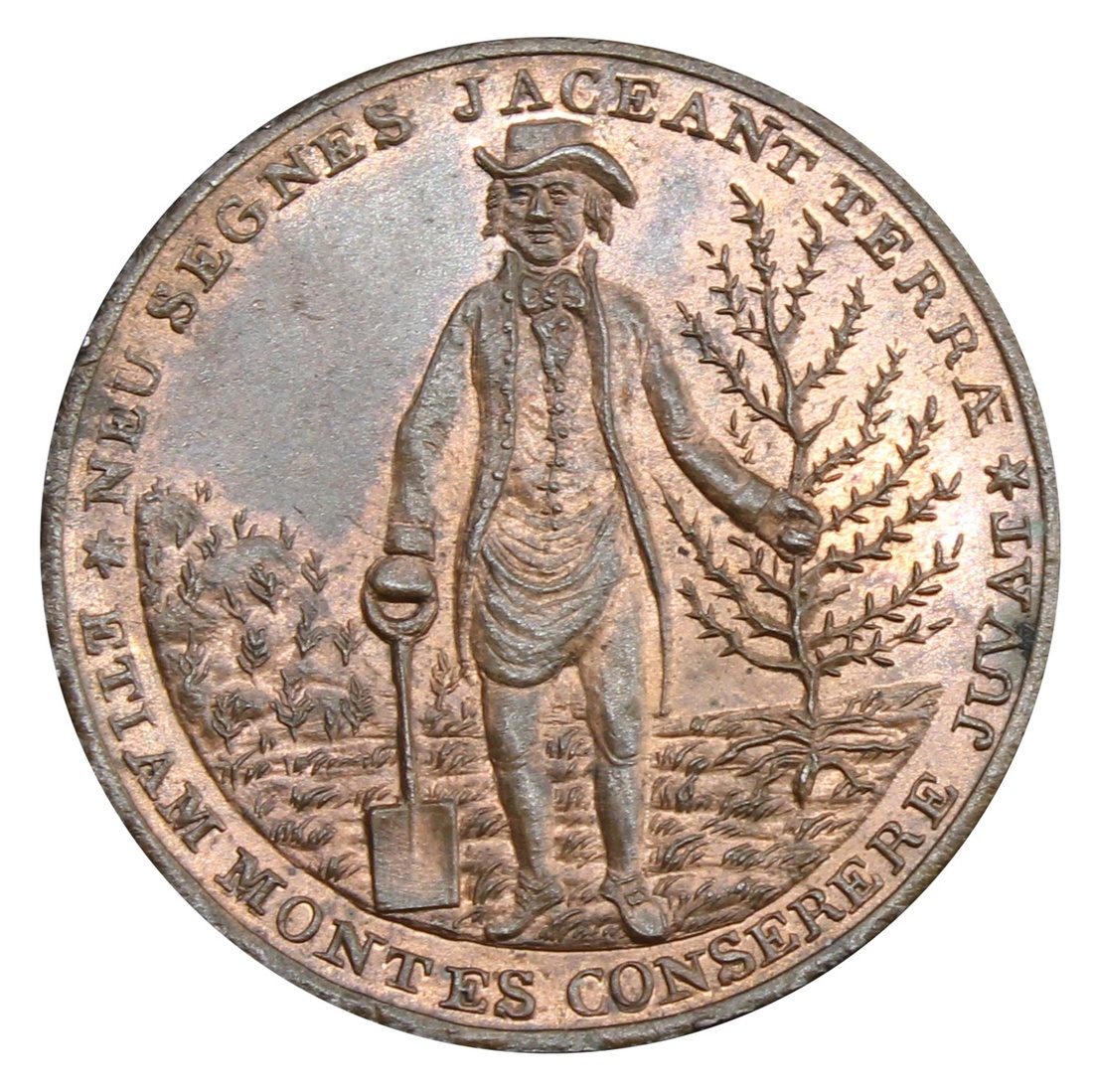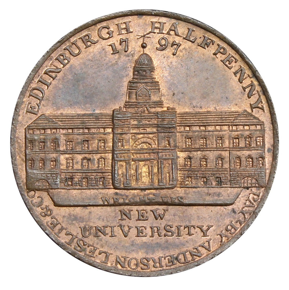 Scotland, Lothian, Edinburgh, New University (Anderson, Leslie & Co.), Halfpenny, 1797, EDINBURGH HALFPENNY | 17-97 | PAYL. BY ANDERSON LESLIE & Co., view of University, WRIGHT DES inscribed below tower rev. NEU SEGNES JACEANT TERRAE | ETIAM MONTES CONSERERE JUVAT, Gardener holding shovel and shrub, foot over ES of MONTES, edge plain, 6h, 11.26g (Conder 64/6; Pye 18/5; Virt pp.190; Atkins 310/5; D&H 7), much mint lustre with patination to higher points, practically as struck, rare thus