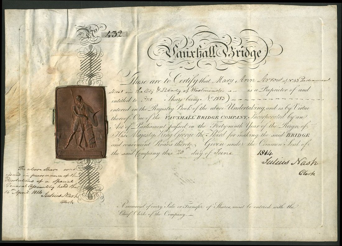 Great Britain: Vauxhall Bridge, certificate for [one] shares, [1814], #432, attractive piece with very unusual copper seal at left, black, on vellum. Designed by James Walker and opened in 1816, this was the first iron bridge over the Thames. It lasted less than 90 years and was demolished in 1898. Some discolouration, VF and scarce.
