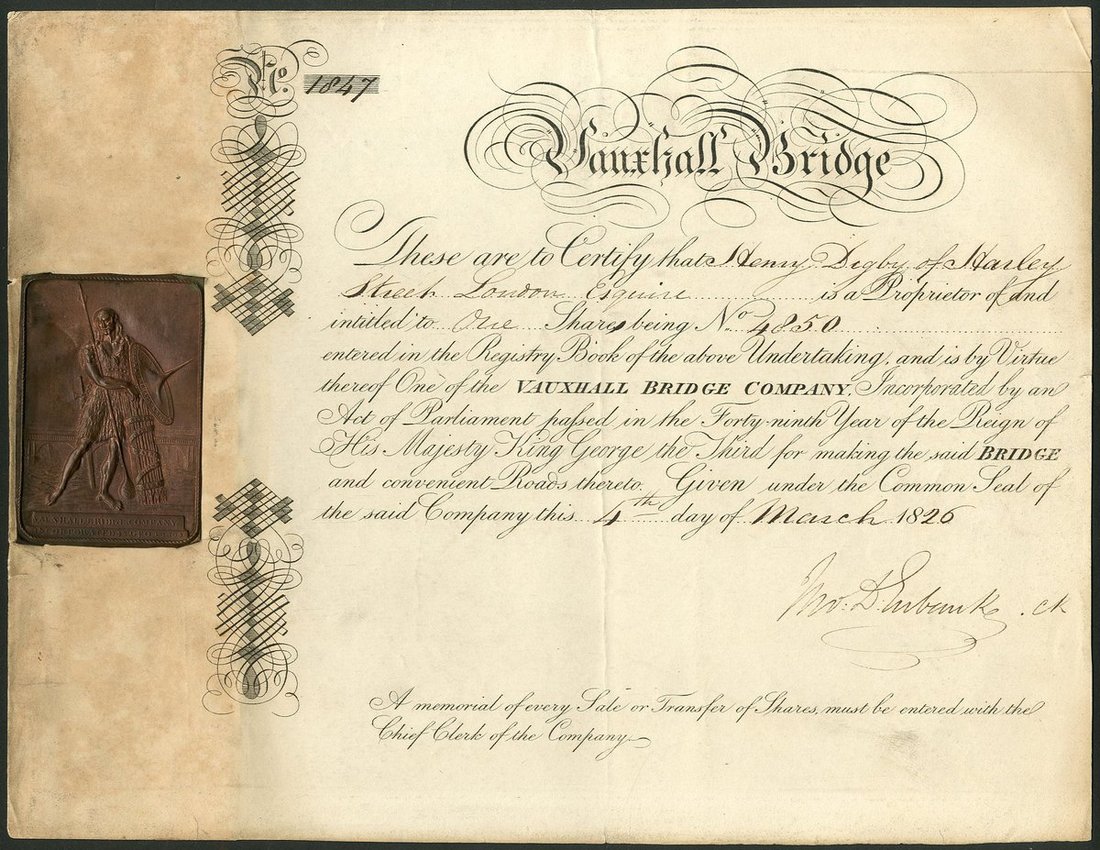Great Britain: Vauxhall Bridge, certificate for [one] shares, 18[26], #1847, attractive piece with very unusual copper seal at left, black, on paper. Designed by James Walker and opened in 1816, this was the first iron bridge over the Thames. It lasted less than 90 years and was demolished in 1898. Somediscolouration at left from the seal but VF and scarce..