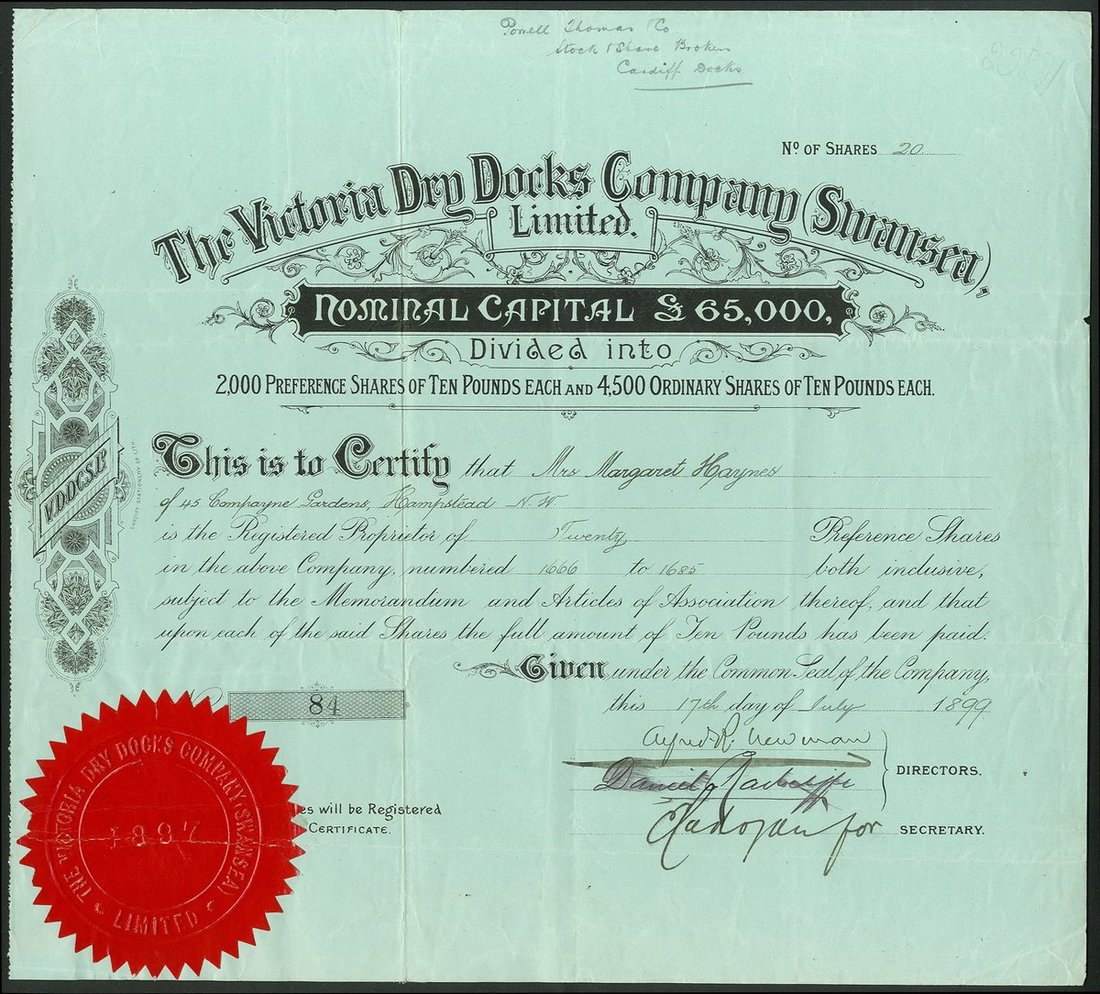 Great Britain: Victoria Dry Docks Company (Swansea) Limited, £10 preference shares, 1[899], #84, attractive black printing on green paper, red paper seal. Acquired the Albion and Globe Dry Docks from the Swansea Dry Docks & Engineering Company, 2 of the nine dry docks built at the port in the 19th century. The Globe now forms part of Swansea Marina. VF and rare.
