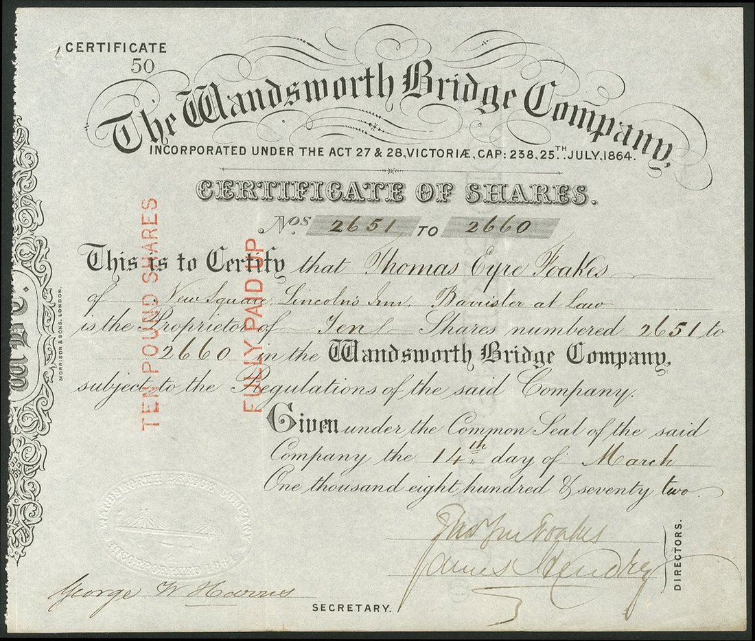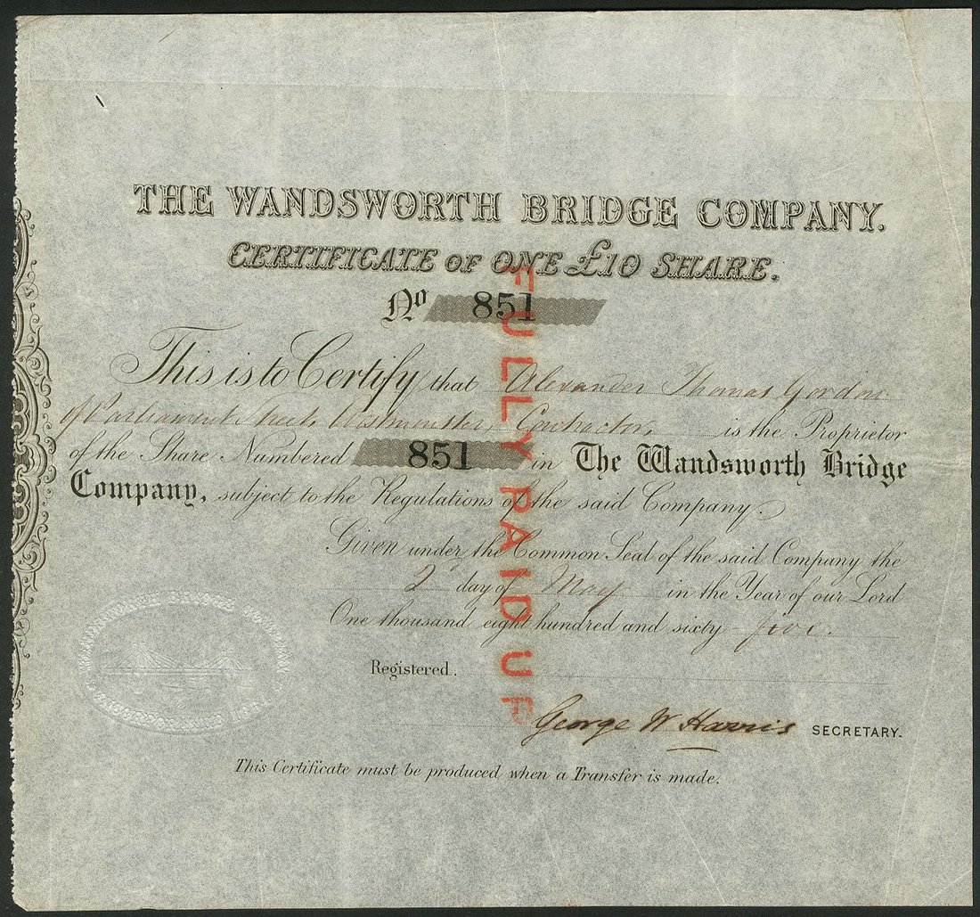 Great Britain: Wandsworth Bridge Company, pair of certificates for £10 share, 186[5], #851, black on thin paper, red 'FULLY PAID UP' on face and £10 shares, 187[2], #50, black. The first bridge was completed in 1873 and was of 5 span lattice-girder construction, as illustrated on the company seal. Built by J.H. Tolme, this bridge across the Thames was taken over by the Metropolitan Board of Works and made free of tolls, like many other London bridges, in 1880. It was replaced in 1940 by the present structure. AEF (2).