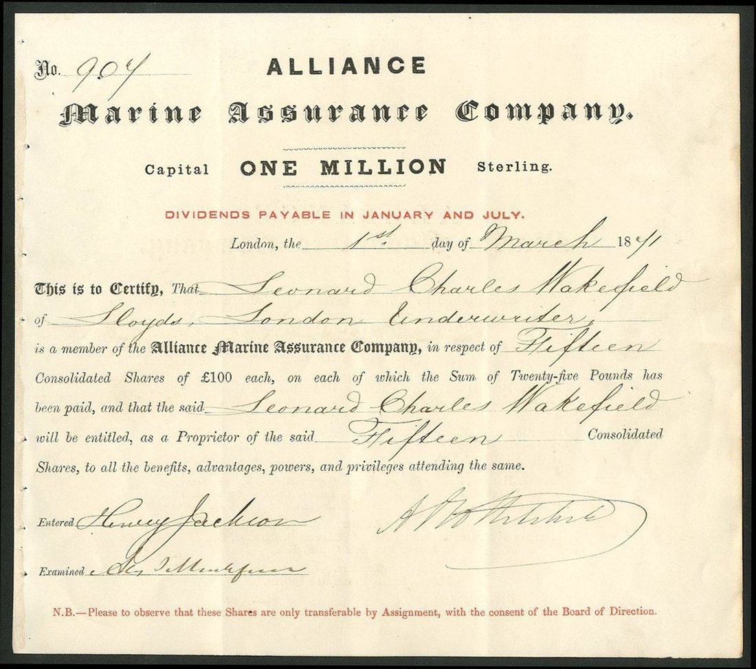 Great Britain: Alliance Marine Assurance Company, £100 Consolidated shares, London 18[71], #907, signed by Alfred Rothschild, plain black and red printing. Formed in 1824 by the Rothschilds, Gurneys and others in conjunction with the Alliance British & Foreign Life & Fire Assurance Company. Stitch holes at left edge, VF and rare.