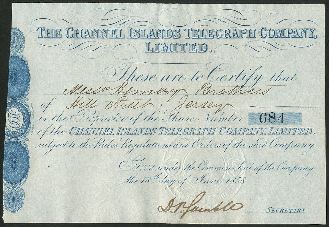 Great Britain: Channel Islands Telegraph Company Limited, one share, 1858, #684, blue, printed by Perkins, Bacon & Co. London. Formed in 1857 as a subsidiary of the Electric Telegraph Company to connect Guernsey, Jersey and Alderney to the mainland. Maintenance was a continual problem so parts were abandoned in 1860. The whole telegraph industry was nationalised by the British Government in 1870. VF-EF and rare.
