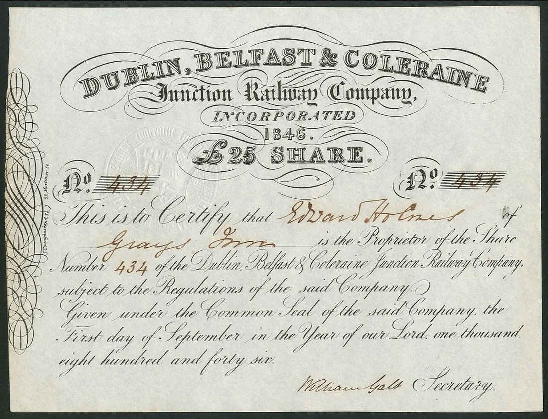 Ireland: Dublin, Belfast & Coleraine Junction Railway Company, £25 share, 1846, #434, scrollwork at left, black, embossed seal. EF.