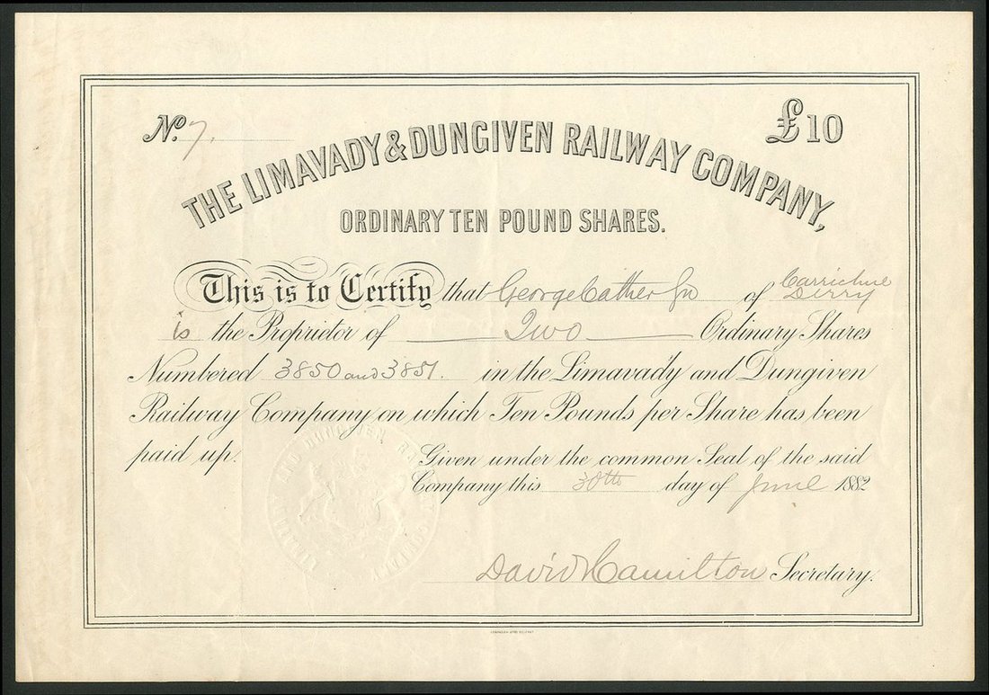 Ireland : Limavady & Dungiven Railway Co., ordinary £10 shares, fully paid, 1882, #7, plain border, black, embossed seal, printed in Belfast. The company was incorporated on 4th July 1878 for a 10 ¼ mile line connecting Dungiven to the Belfast and Northern Counties Railway in Limavady. It was later amalgamated with this company in 1907. VF and scarce.