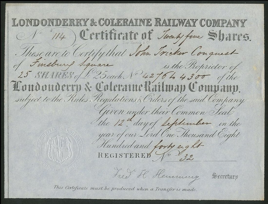 Ireland : Ireland: Londonderry & Coleraine Railway Company, £25 shares, 18[48], #114, black on blue paper. Built from Derry to Coleraine in the 1840's later joing the Belfast line. EF and scarce.