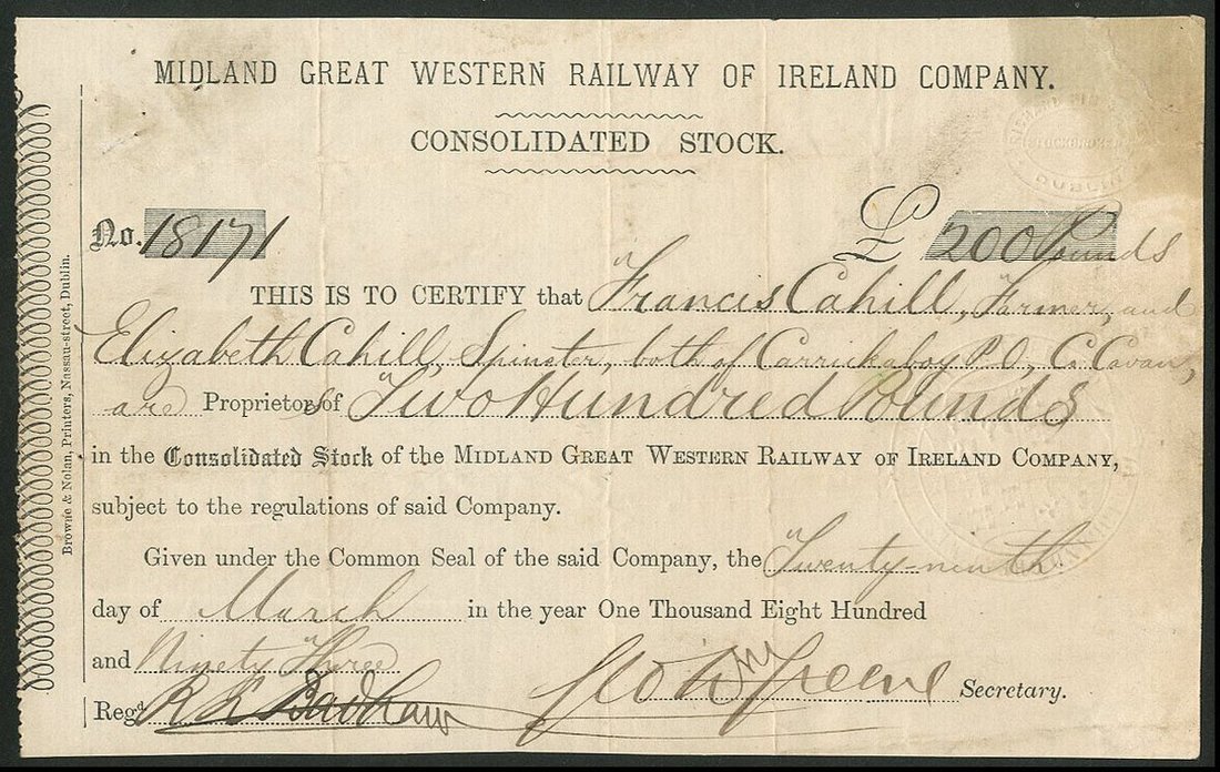 Ireland : Midland Great Western Railway of Ireland Company, consolidated stock certificate, 18[93], #18171, black. Some surface dirt and repair to top right corner, F-VF and very rare.