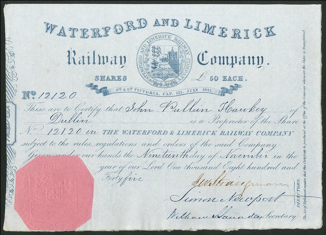 Ireland: Waterford & Limerick Railway Co., £50 share, 184[5], #12120, attractive coat of arms within medallion top centre, blue, pink embossed seal. EF.