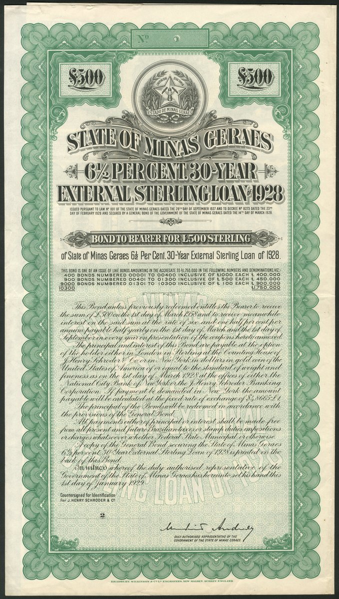 Brazil: State of Minas Geraes, 6½% 30yr External Sterling Loan of 1928, specimen bond for £500 from the Bradbury, Wilkinson & Co. archive, large format piece with State coat of arms at top, green, with coupons, small hole cancels in signature area. Nick in left edge, GVF [R11].