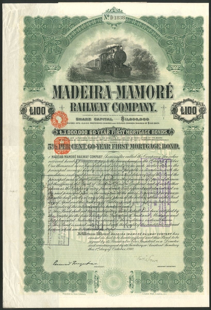 Brazil: Madeira-Mamoré Railway Company, 5½% 60-Year First Mortgage bond for £100, 1910, #D1838, large format piece with steam train at top, ornate border, green and black, printed by Waterlow & Sons, with coupons. GVF and now scarce.
