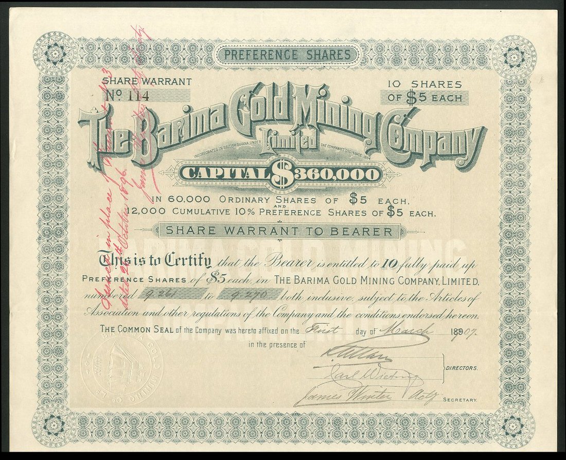 British Guiana: Barima Gold Mining Company Limited, bearer certificate for 10 shares of $5, 189[907], #114, ornate border, green, with coupons. A rare locally registered piece of which a small group were found some years ago, GVF.