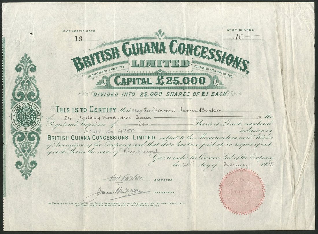 British Guiana: British Guiana Concessions Limited, £1 shares, 190[5], #16, scrollwork at left, green, red seal. Registered in 1903 to acquire the L.E.Henery mining claims and concessions on Suquabiyu Creek, Upper Potaro River. VF and rare.