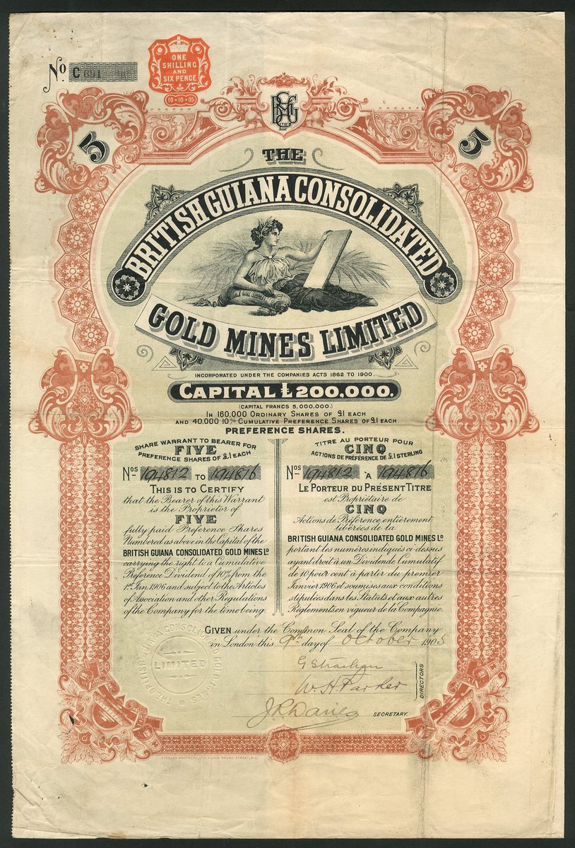 British Guiana: British Guiana Consolidated Gold Mines Limited, 5 preference shares of £1 to bearer, London 190[5], #C691, allegorical female in centre, red with pale green underprint, with coupons. Folds and a few pinholes, F-VF and rare.